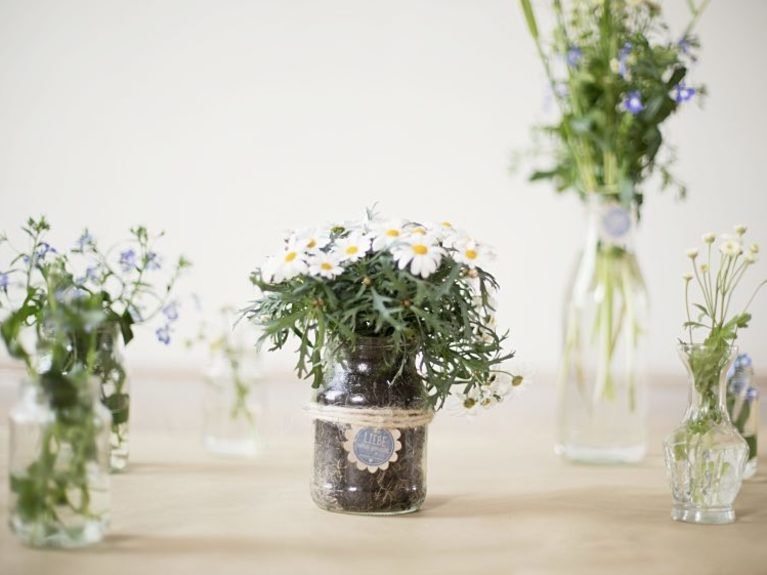 Prepara los materiales para hacer tu maceta: elige las flores que vayas a colocar y ten en cuenta el tamaño del frasco, debe ser lo suficientemente grande como para colocar la planta.