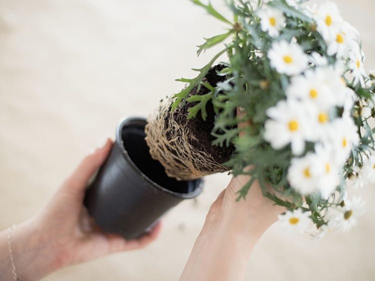 Quitamos con mucho cuidado la planta de la maceta. Debes hacerlo poco a poco para que la tierra no pierda la forma y las raíces queden en su sitio.