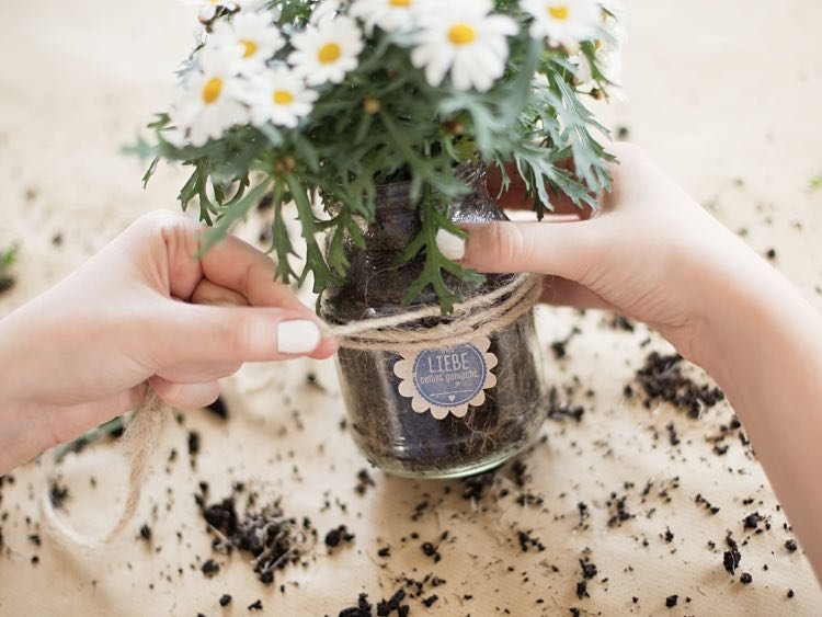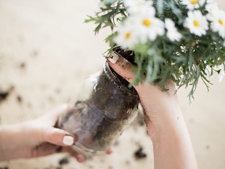 Ahora trasplantamos la flor al tarro de cristal. De nuevo, hazlo con mucho cuidado para no dañar las raíces de la planta.